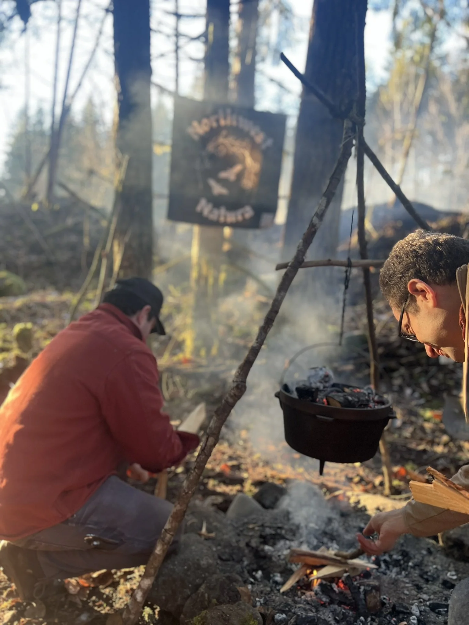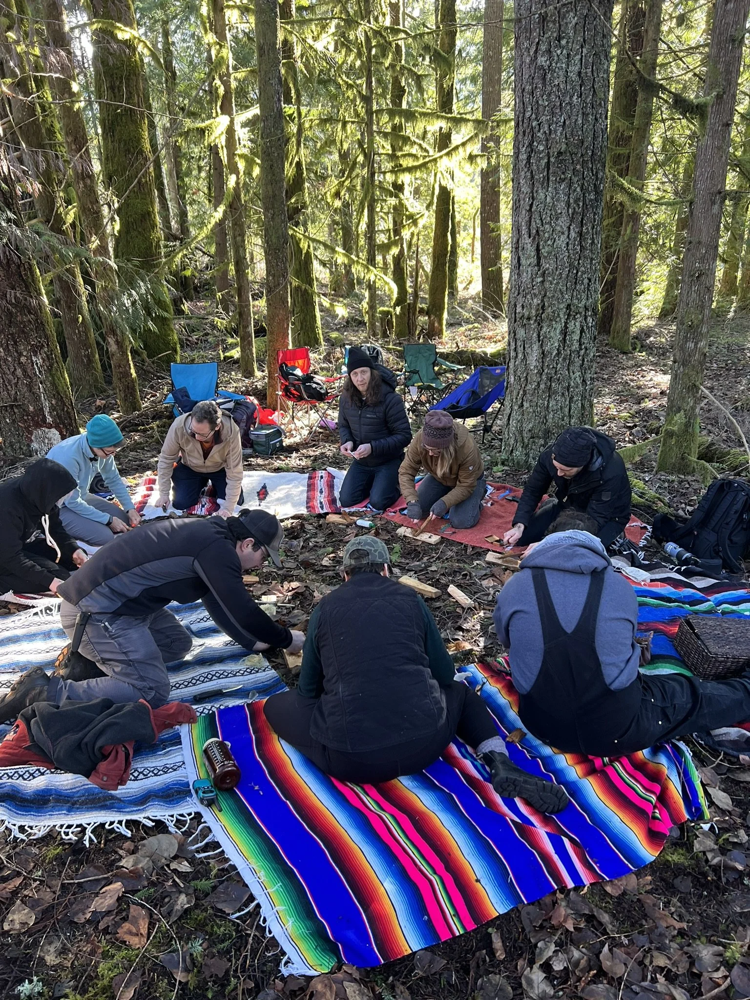 Campfires (3) and shelters (2) are provided in anticipation of normal PNW February weather. Participants should expect at least a little rain and 40F range ambient temperature away from shelter or fire areas and are encouraged to dress warmly and appropriately for an outdoor workshop. Hot beverages will be provided (cocoa, coffee, tea).