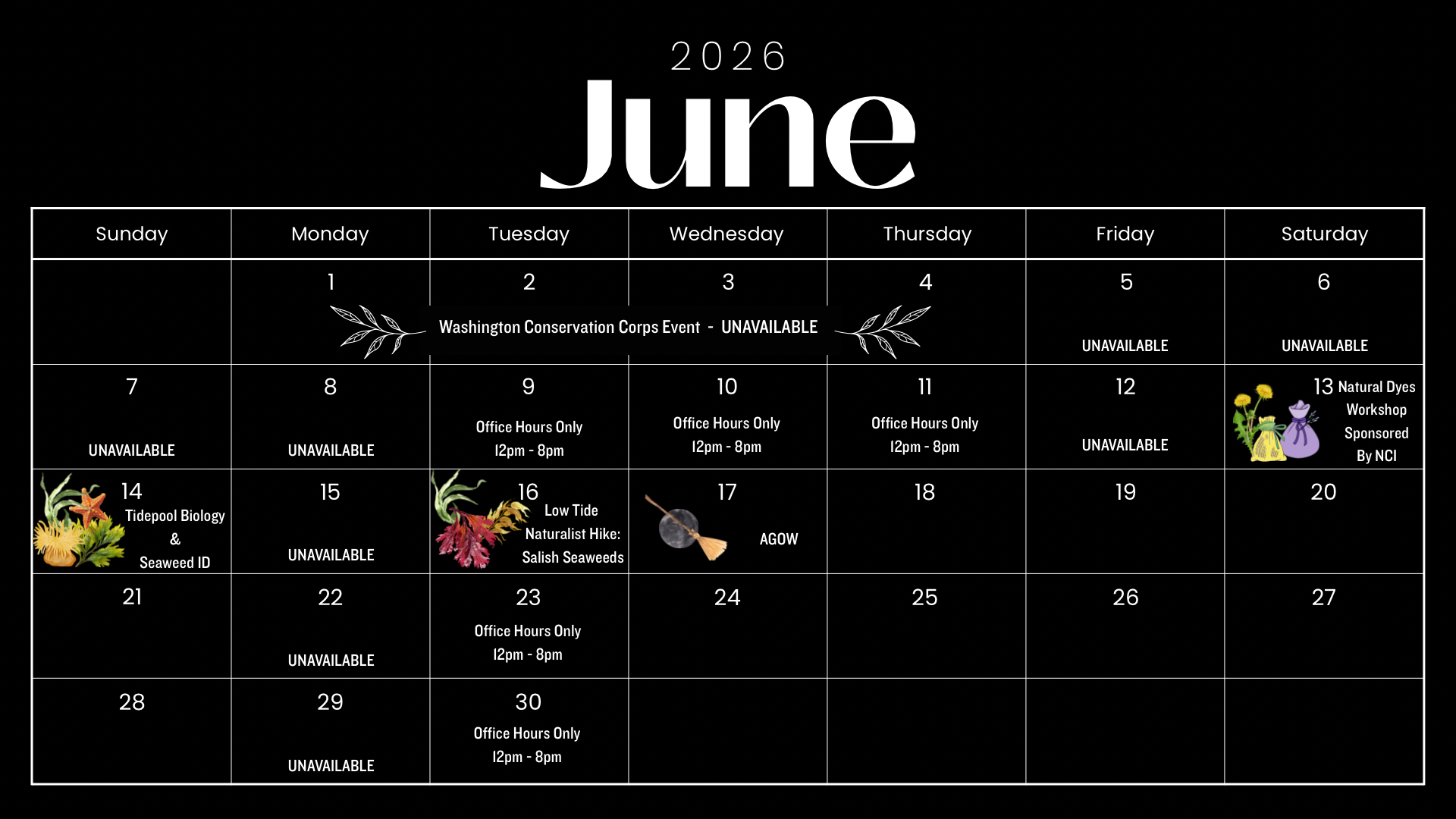 I (Jazmen) am the founder, operator, author, and primary instructor for all offered events. All courses are designed and implemented by me including those for the State of Washington Department of Ecology (AmeriCorps), Whatcom Community College (Discover), and North Cascades Institute, with the exception of the Washington Native Plant Society’s Plant ID & Keying Course, designed originally by my former instructor, Abe Lloyd, but adapted by me to fit my teaching style in 2025. Occasionally I collaborate with other naturalists such as Mark Thompson of Cambium Ecological, Madelaine Katz (Marine Science), and Ryan Johnson of Firecraft Northwest. I pay a friend to help advertise events and design the calendars for the website. I may also have a friend shadowing me during intensive workshops.